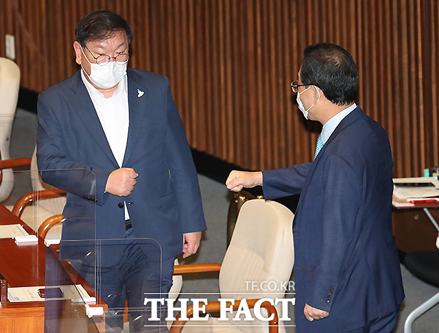 [더팩트ㅣ국회=남윤호 기자] 김태년 더불어민주당 원내대표(왼쪽)와 주호영 국민의힘 원내대표가 7일 오전 서울 여의도 국회에서 열린 제382회국회(정기회) 제2차 본회의에 참석해 주먹을 들어 인사하고 있다.