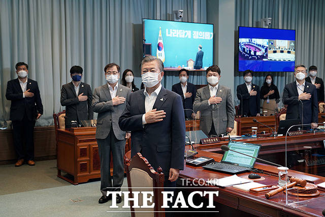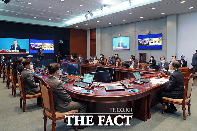 [더팩트ㅣ배정한 기자] 문재인 대통령이 8일 오전 청와대 여민관에서 열린 제45회 국무회의를 주재하고 있다. 이날 회의에는 수석·보좌관들만 참석했으며 장관들은 화상으로 참석했다.