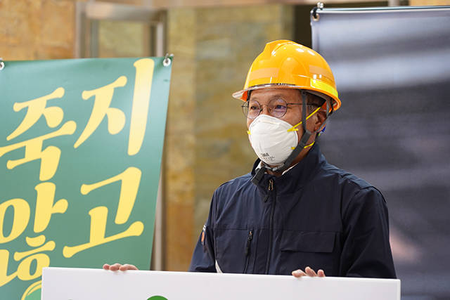 [더팩트ㅣ배정한 기자] 배진교 정의당 원내대표가 8일 오후 서울 여의도 국회 로텐더홀에서 중대재해기업처벌법 제정 촉구 1인 시위를 하고 있다.