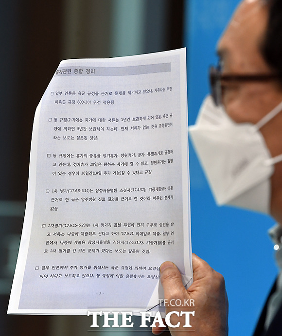 [더팩트ㅣ국회=이새롬 기자] 국회 법제사법위원회 소속 김도읍 국민의힘 의원이 10일 오후 서울 여의도 국회 소통관에서 긴급 기자회견을 열고 추미애 장관 아들 군 병가 특혜 의혹 관련 여당 내 대응문건을 공개하고 있다.