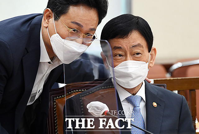 [더팩트ㅣ국회=이새롬 기자] 진영 행정안전부 장관(오른쪽)이 14일 오전 서울 여의도 국회에서 열린 행정안전위원회 전체회의에서 보고를 받고 있다.