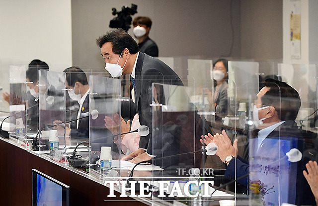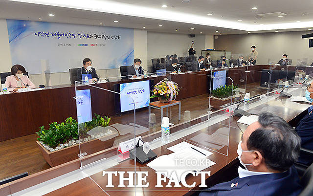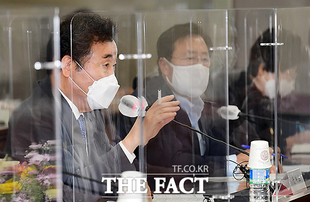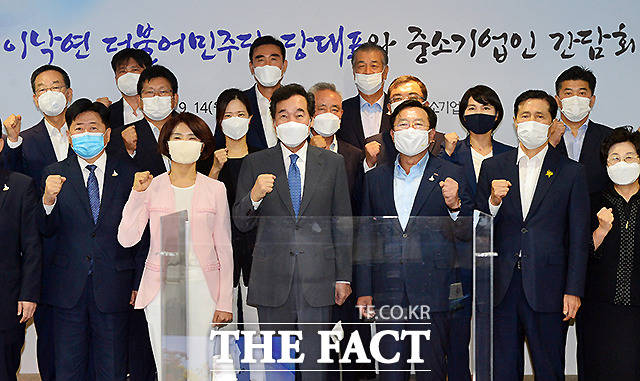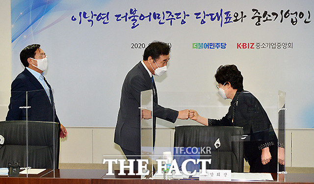 [더팩트ㅣ이새롬 기자] 이낙연 더불어민주당 대표가 14일 서울 여의도 중소기업중앙회를 찾아 중소기업인들과 간담회를 갖고 있다. 오른쪽은 김기문 중소기업중앙회장.