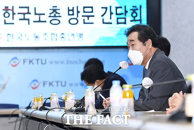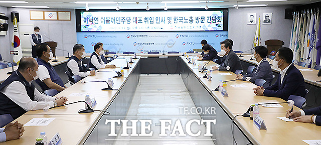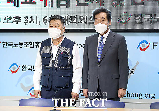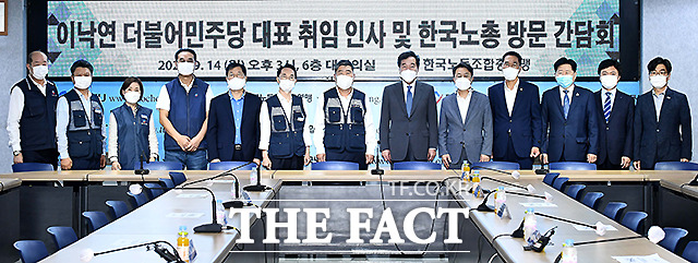 [더팩트ㅣ이새롬 기자] 이낙연 더불어민주당 대표(오른쪽)가 14일 서울 여의도 한국노총을 찾아 간담회에 앞서 김동명 한국노동조합총연맹 위원장과 함께 기념촬영을 하고 있다.