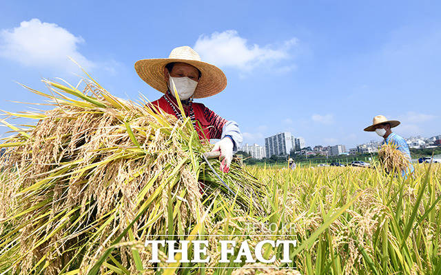 [더팩트ㅣ수원=임영무 기자] 완연한 가을 날씨에 접어든 15일 오전 경기 수원시 농촌진흥청 국립식량과학원에서 농부들이 벼베기를 하고 있다.