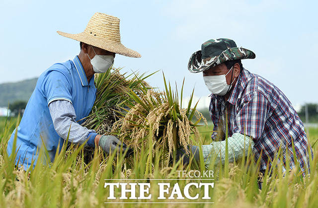 [더팩트ㅣ수원=임영무 기자] 완연한 가을 날씨에 접어든 15일 오전 경기도 수원 농촌진흥청 국립식량과학원에서 농부들이 벼베기를 하고 있다.