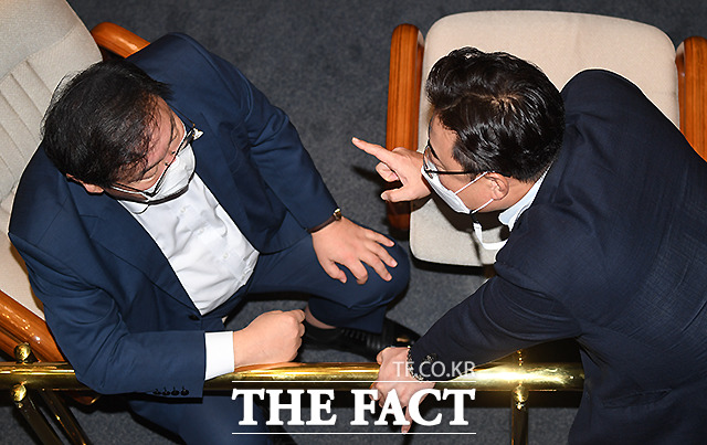 [더팩트ㅣ국회=이새롬 기자] 김태년 더불어민주당 원내대표(왼쪽)와 김성원 국민의힘 원내수석부대표가 15일 서울 여의도 국회 본회의장에서 열린 외교·통일·안보 분야 대정부질문에 참석해 대화를 나누고 있다.