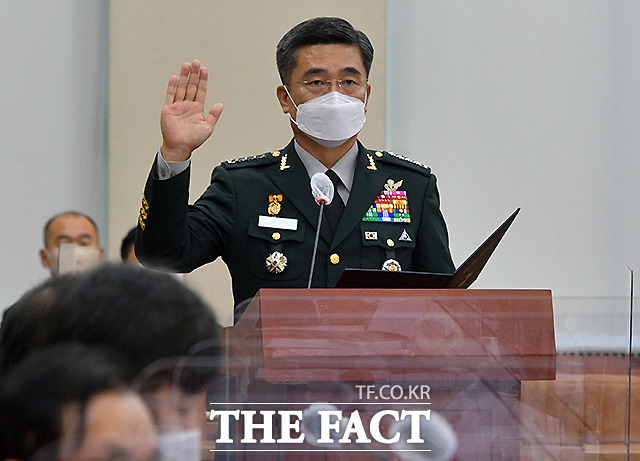 [더팩트ㅣ국회=이새롬 기자] 서욱 국방장관 후보자가 16일 서울 여의도 국회에서 열린 인사청문회에 출석해 증인선서를 하고 있다.