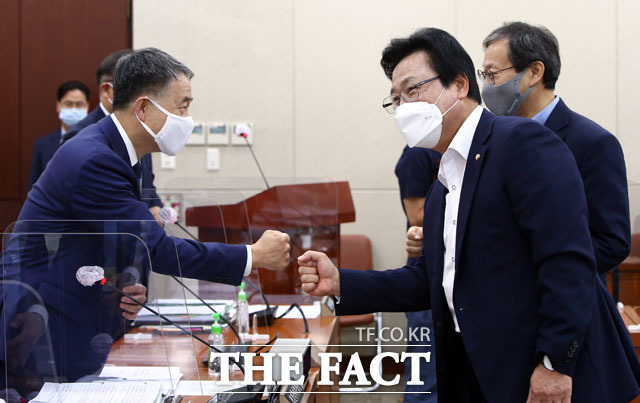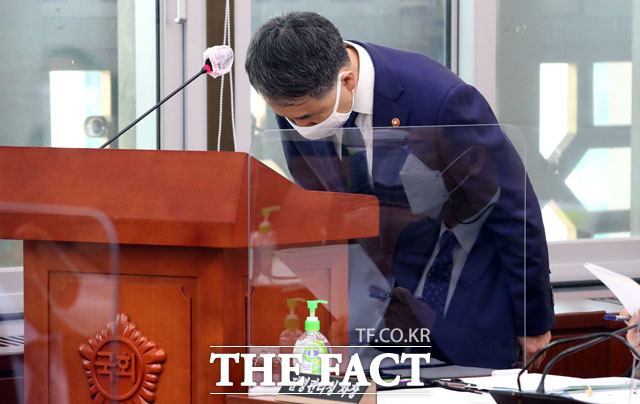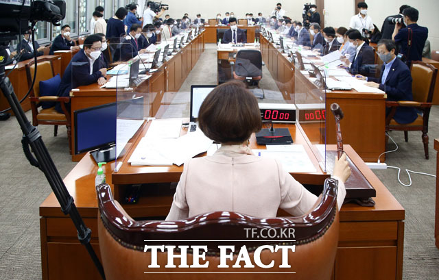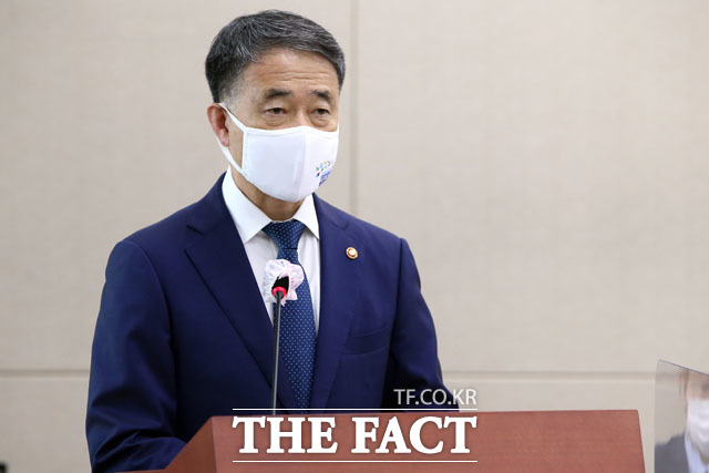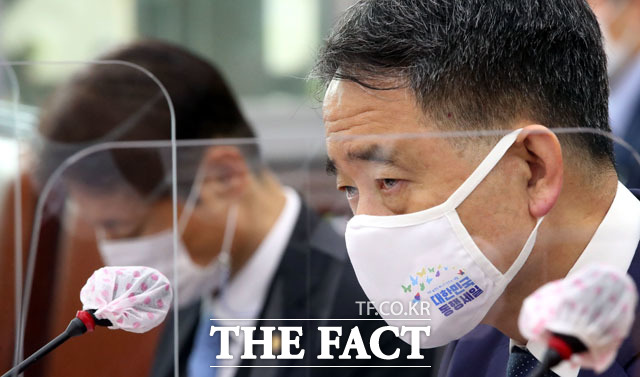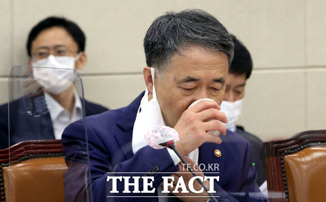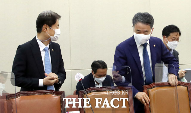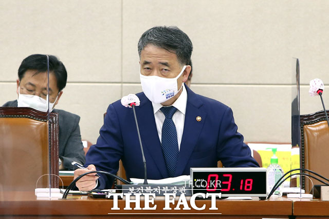 [더팩트 | 국회=남윤호 기자] 박능후 보건복지부 장관(왼쪽)이 17일 오전 서울 여의도 국회에서 열린 보건복지위원회 전체회의에 출석해 발언을 하고 있다.