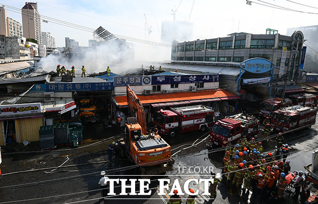 [더팩트ㅣ이동률 기자] 21일 오전 서울 동대문구 청량리 청과물시장에서 발생한 화재를 소방대원들이 진화하고 있다