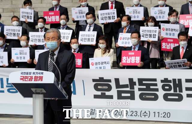 [더팩트 | 국회=남윤호 기자] 김종인 국민의힘 비상대책위원장이 23일 오전 서울 여의도 국회 본청앞에서 열린 호남동행국회의원 발대식에서 인사말을 하고 있다.