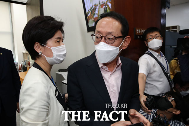 [더팩트 | 국회=남윤호 기자] 김도읍 국민의힘 간사(가운데)가 23일 오후 서울 여의도 국회 법제사법위원회 소회의실 앞에서 법안심사1소위에 고위공직자수사처법 개정안이 기습상정되자 이에 반발하며 기자회견을 열고 있다. 왼쪽은 더불어민주당 소속 백혜련 간사로 김도읍 간사에게 회의장에서 얘기할 것을 요청하고 있다.