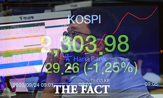 [더팩트ㅣ이동률 기자] 코스피 지수가 전 거래일 대비 37.62포인트(1.61%) 내린 2,295.62으로 출발한 24일 오전 서울 을지로 하나은행 딜링룸에서 딜러들이 업무를 보고 있다.