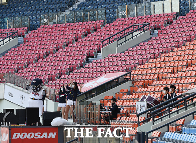 [더팩트ㅣ배정한 기자] 2020 KBO리그 두산 베어스와 키움 히어로즈의 경기가 26일 오후 서울 송파구 잠실야구장에서 열린 가운데 두산 치어리더들이 응원을 하고 있다.