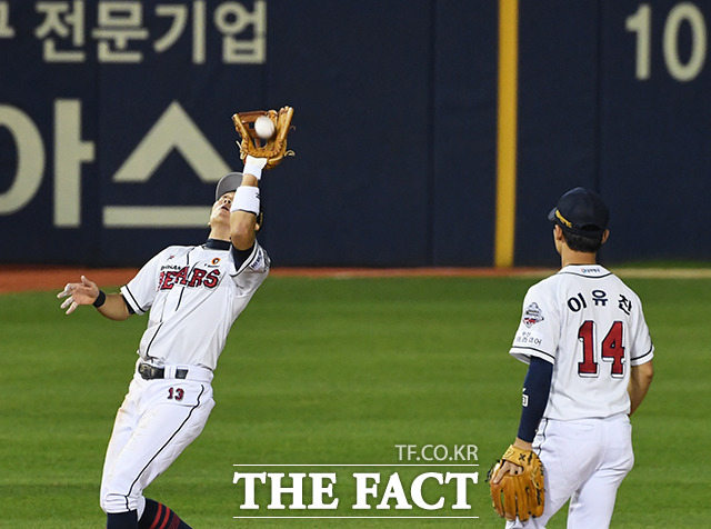 [더팩트ㅣ배정한 기자] 2020 KBO리그 두산 베어스와 키움 히어로즈의 경기가 26일 오후 서울 송파구 잠실야구장에서 열린 가운데 7회초 두산 허경민(왼쪽)이 키움 러셀의 타구를 잡고 있다. hany@tf.co.kr 사진영상기획부 photo@tf.co.kr