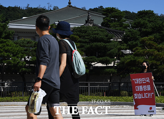 [더팩트ㅣ배정한 기자] 전주혜 국민의힘 의원이 27일 오전 청와대 분수대 앞에서 북한의 해수부 공무원 피격 사망사건 진상조사를 요구하는 1인 시위를 하고 있다.