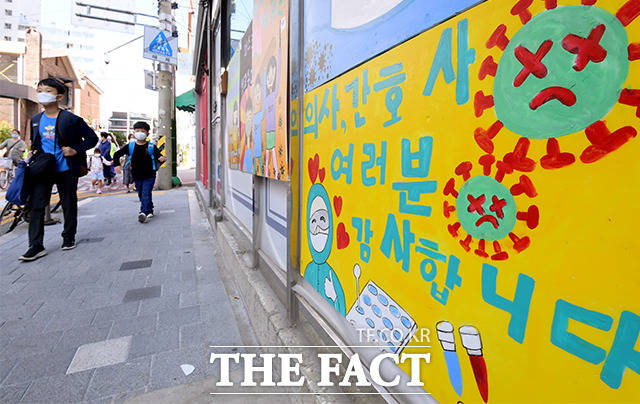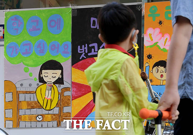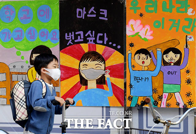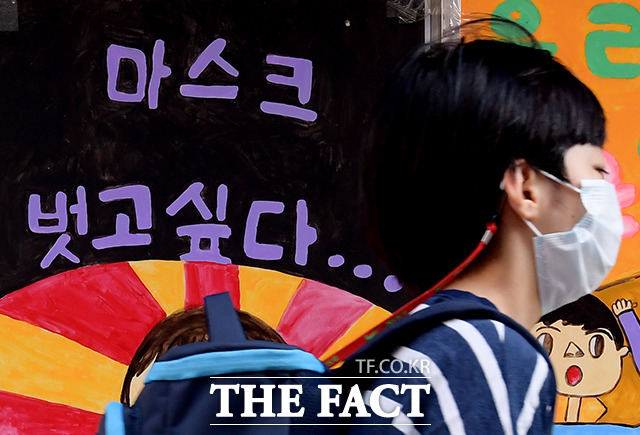 [더팩트|이선화 기자] 코로나19 확산이 계속되고 있는 28일 오후 서울 마포구 동교초등학교 인근에서 한 초등학생이 마스크를 쓴 채 등교를 하고 있다.