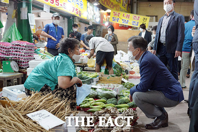 [더팩트ㅣ배정한 기자] 문재인 대통령과 김정숙 여사가 추석 명절을 앞둔 29일 서울 서대문구의 한 전통시장을 찾아 장을 보고 있다.