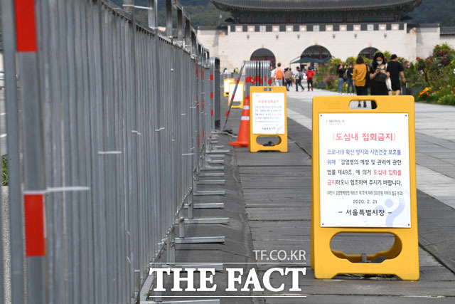 [더팩트 | 남윤호 기자] 개천절을 이틀 앞둔 1일 오전 서울 종로구 광화문광장에 도심내 집회를 대비한 펜스들이 설치돼 있다.