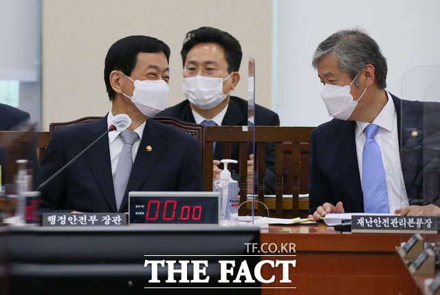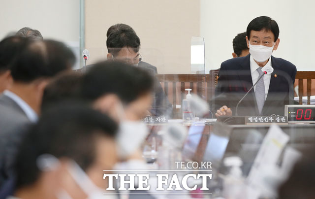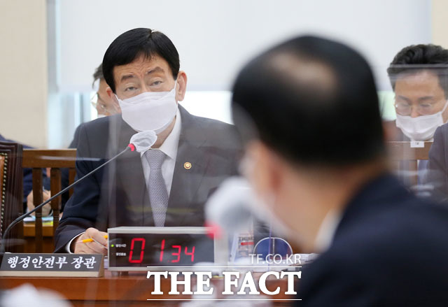 진영 행정안전부 장관이 7일 오전 서울 여의도 국회에서 행정안전위원회의 행정안전부에 대한 국정감사에 출석해 선서를 하고 있다. /국회=남윤호 기자