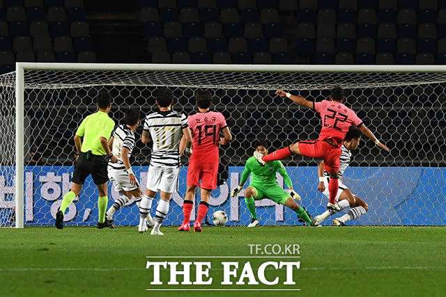 [더팩트ㅣ고양종합운동장=남용희 기자] 하나은행컵 축구국가대표팀 대 올림픽대표팀 친선경기 1차전이 9일 오후 경기도 고양시 고양종합운동장에서 진행되고 있는 가운데 국가대표팀 이주용이 슈팅을 하고 있다.