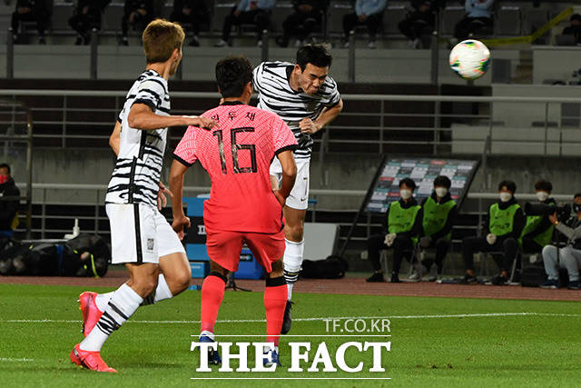 [더팩트ㅣ고양종합운동장=남용희 기자] 하나은행컵 축구국가대표팀 대 올림픽대표팀 친선경기 1차전이 9일 오후 경기도 고양시 고양종합운동장에서 진행되고 있는 가운데 올림픽대표 송민규가 헤더를 시도하고 있다.