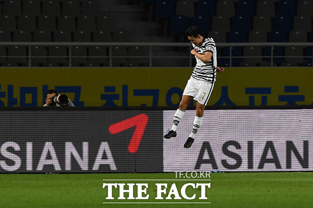 [더팩트ㅣ고양종합운동장=남용희 기자] 하나은행컵 축구국가대표팀 대 올림픽대표팀 친선경기 1차전이 9일 오후 경기도 고양시 고양종합운동장에서 진행되고 있는 가운데 올림픽대표 송민규가 득점한 뒤 세리머니를 하고 있다.