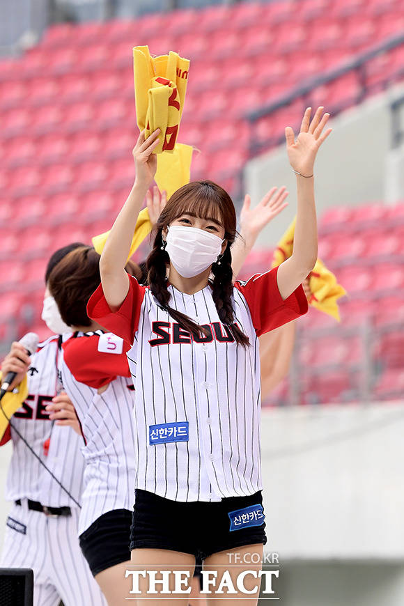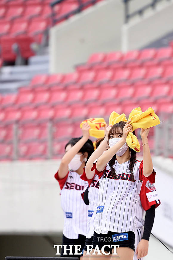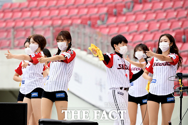 [더팩트|이선화 기자] 11일 오후 서울 송파구 잠실종합운동장 잠실야구장에서 2020 KBO리그 LG 트윈스와 NC 다이노스의 경기가 열린 가운데 LG 치어리더가 텅 빈 관중석 앞에서 경기를 응원하고 있다.