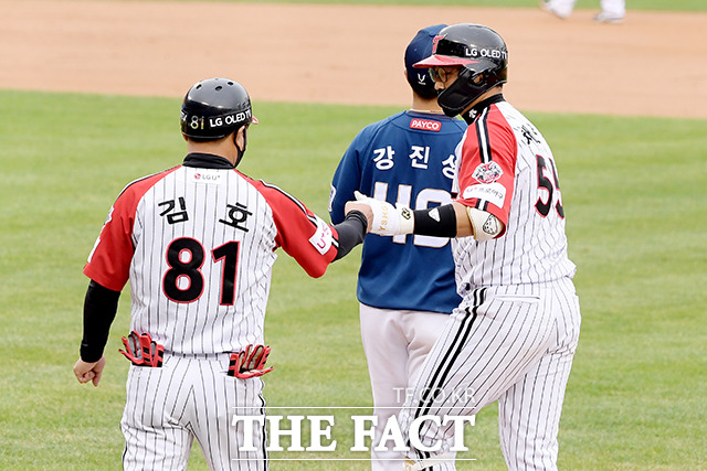 [더팩트|이선화 기자] 11일 오후 서울 송파구 잠실종합운동장 잠실야구장에서 2020 KBO리그 LG 트윈스와 NC 다이노스의 경기가 열린 가운데 LG 채은성이 안타를 친 후 김호 코치와 주먹을 맞대고 있다.seonflower@tf.co.kr사진영상기획부 photo@tf.co.kr