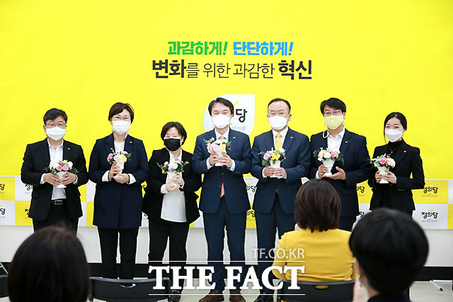 [더팩트ㅣ이효균 기자] 김종철 정의당 신임 대표(왼쪽)와 심상정 전 대표가 11일 오전 서울 여의도 국회에서 열린 5·6기 지도부 이·취임식에서 당 깃발을 흔들고 있다.