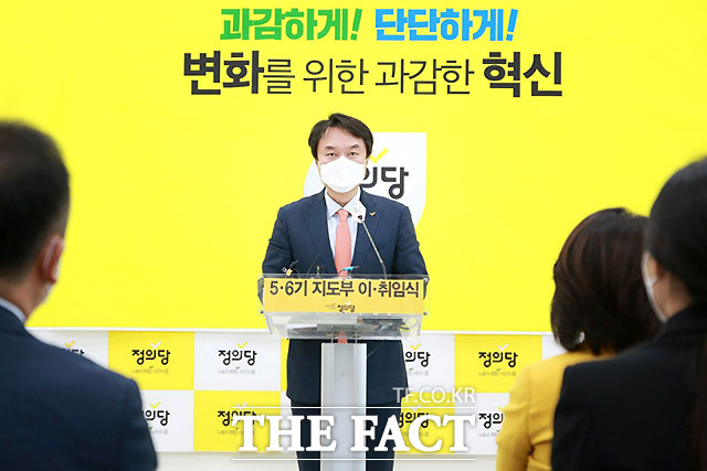 [TF사진관] 정의당 5·6기 지도부 이·취임식, '깃발 흔드는 김종철 신임 대표'
