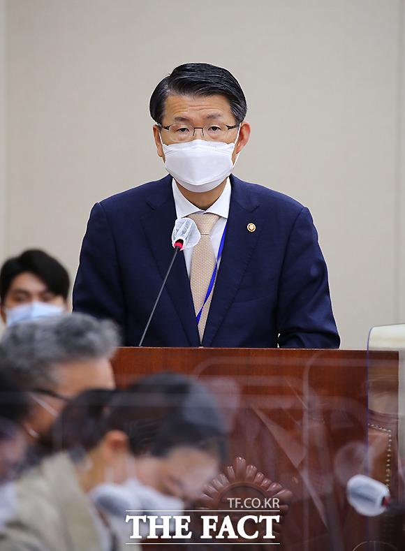 은성수 금융위원장이 12일 오전 국회에서 열린 정무위원회 국정감사에서 선서를 하고 있다. /국회=이새롬 기자