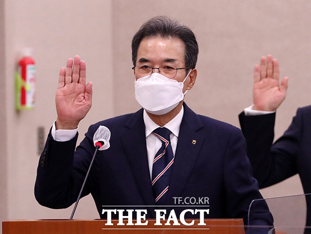 [더팩트 | 국회=남윤호 기자] 이성희 농협중앙회장이 16일 서울 여의도 국회에서 열린 농림축산식품해양수산위원회의 농협중앙회, 농협금융지주 등에 대한 국정감사에 출석해 선서를 하고 있다.