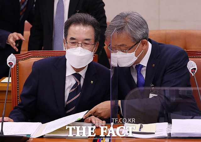 [더팩트 | 국회=남윤호 기자] 이성희 농협중앙회장(왼쪽)과 장철훈 농업경제 대표이사가 16일 서울 여의도 국회에서 열린 농림축산식품해양수산위원회의 농협중앙회, 농협금융지주 등에 대한 국정감사에 출석해 대화를 나누고 있다. ilty012@tf.co.kr 사진영상기획부 photo@tf.co.kr