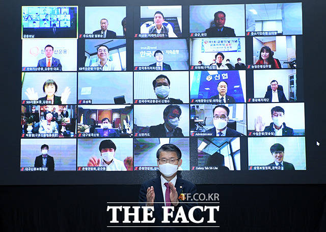 [더팩트ㅣ남용희 기자] 은성수 금융위원장이 27일 오전 서울 여의도 63컨벤션센터에서 진행된 제5회 금융의 날 기념식에 참석해 표창 수상자들과 화상으로 기념촬영을 하고 있다.