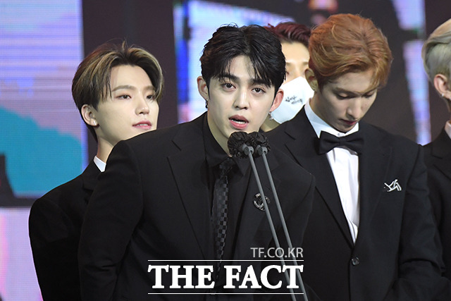 [더팩트|이선화 기자] 그룹 세븐틴의 에스쿱스가 28일 오후 서울 동대문구 경희대학교 서울캠퍼스 평화의전당에서 열린 '2020 대한민국 대중문화예술상'에 참석해 국무총리 표창 수상 후 소감을 밝히고 있다.