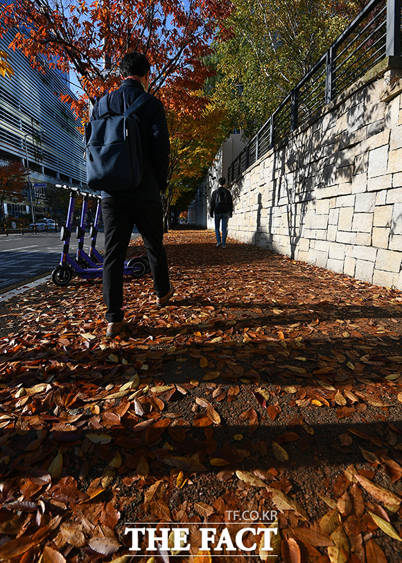 [TF포토] 낙엽과 함께하는 출근길
