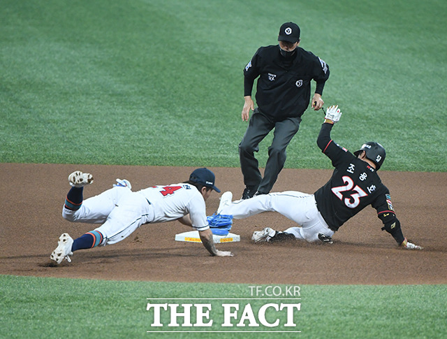 [더팩트ㅣ배정한 기자] '2020 신한은행 SOL KBO리그' 플레이오프 3차전 두산 베어스와 KT 위즈의 경기가 12일 오후 서울 구로구 고척스카이돔에서 열렸다. 6회초 kt 조용호(오른쪽)가 안타를 친 뒤 2루 베이스를 밟고 있다. hany@tf.co.kr 사진영상기획부 photo@tf.co.kr