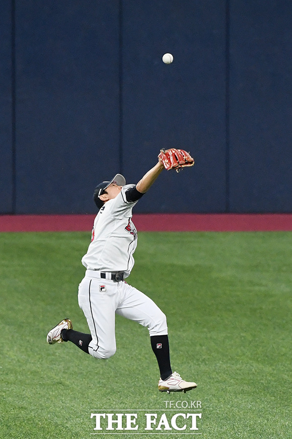 [더팩트ㅣ배정한 기자] '2020 신한은행 SOL KBO리그' 플레이오프 3차전 두산 베어스와 KT 위즈의 경기가 12일 오후 서울 구로구 고척스카이돔에서 열렸다. 8회초 두산 정수빈이 KT 배정대의 타구를 놓치고 있다.