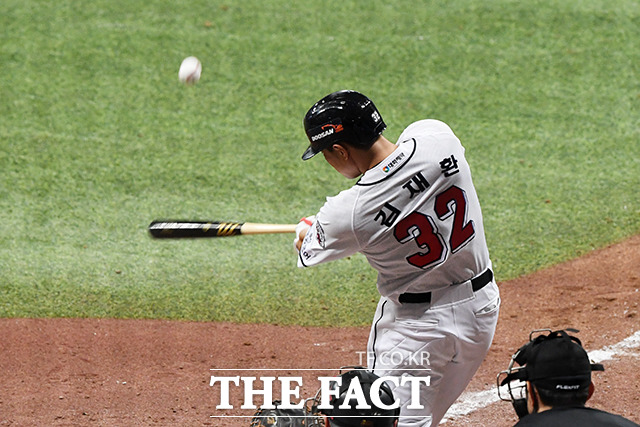 [더팩트ㅣ배정한 기자] '2020 신한은행 SOL KBO리그' 플레이오프 3차전 두산 베어스와 KT 위즈의 경기가 12일 오후 서울 구로구 고척스카이돔에서 열렸다. 9회말 두산 김재환이 솔로홈런을 치고 있다.