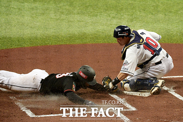 [더팩트|이선화 기자] '2020 KBO 포스트시즌' 플레이오프 4차전 두산 베어스와 KT 위즈의 경기가 13일 오후 서울 구로구 고척스카이돔에서 열린 가운데 KT 조용호가 두산 포수 박세혁에게 태그아웃 되고 있다.