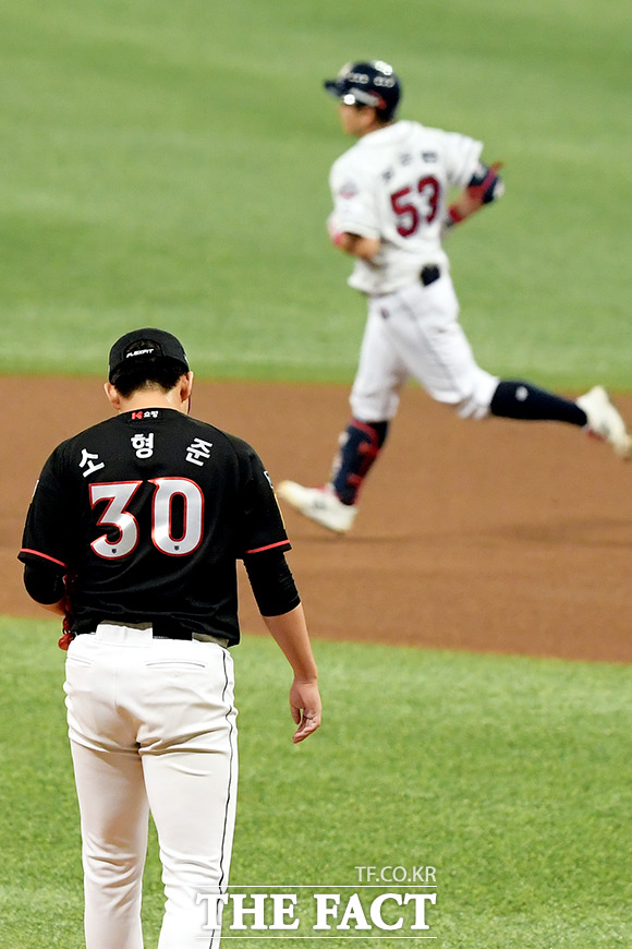 [더팩트|이선화 기자] '2020 KBO 포스트시즌' 플레이오프 4차전 두산 베어스와 KT 위즈의 경기가 13일 오후 서울 구로구 고척스카이돔에서 열린 가운데 4회말 두산 최주환에게 투런 홈런을 내준 KT 투수 소형준이 고개를 숙인 채 아쉬워하고 있다.