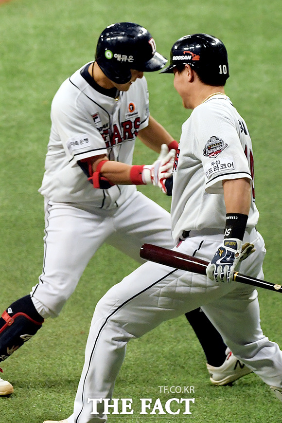[더팩트|이선화 기자] '2020 KBO 포스트시즌' 플레이오프 4차전 두산 베어스와 KT 위즈의 경기가 13일 오후 서울 구로구 고척스카이돔에서 열린 가운데 4회말 두산 최주환이 투런 홈런을 친 후 박세혁(오른쪽)과 기쁨의 하이파이브를 나누고 있다.seonflower@tf.co.kr사진영상기획부 photo@tf.co.kr