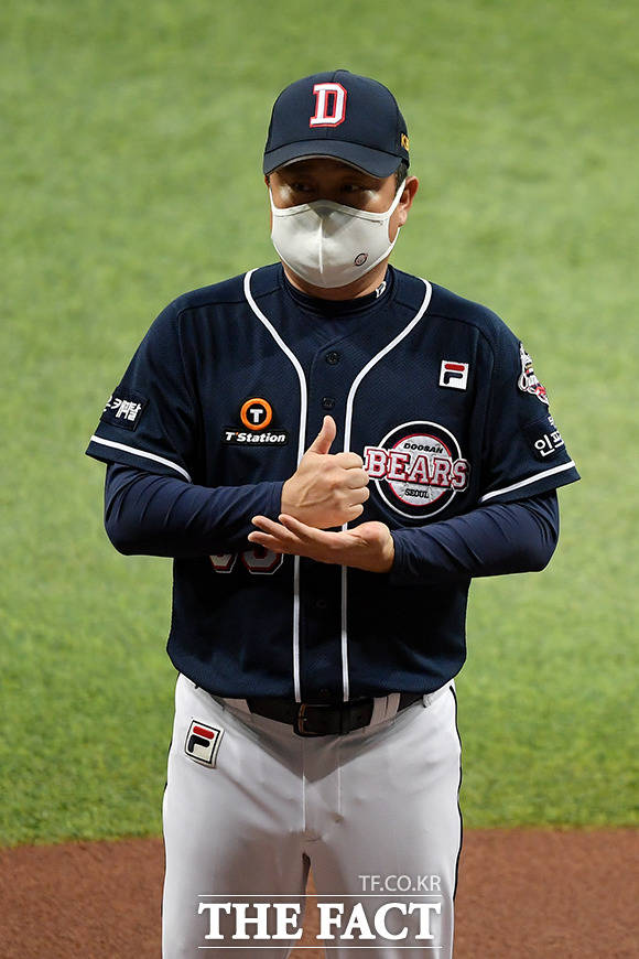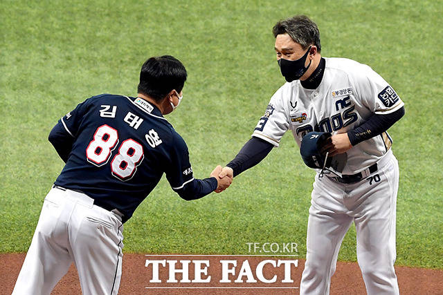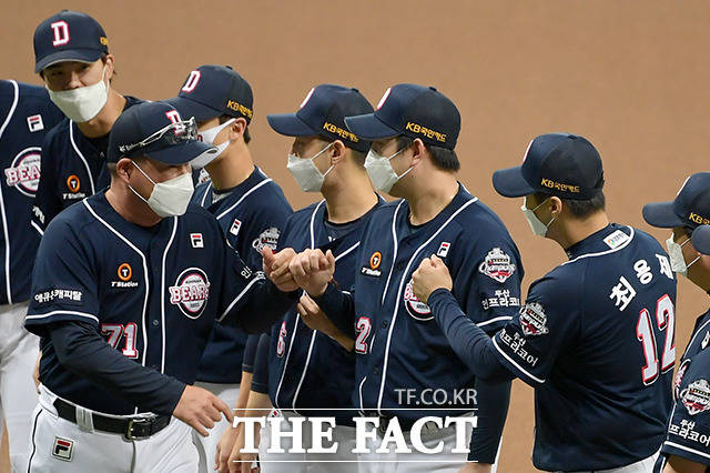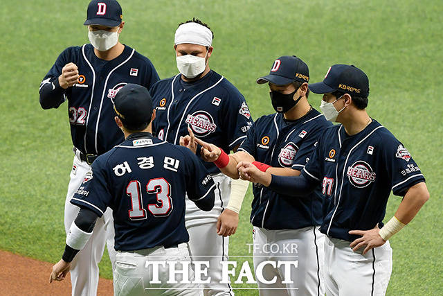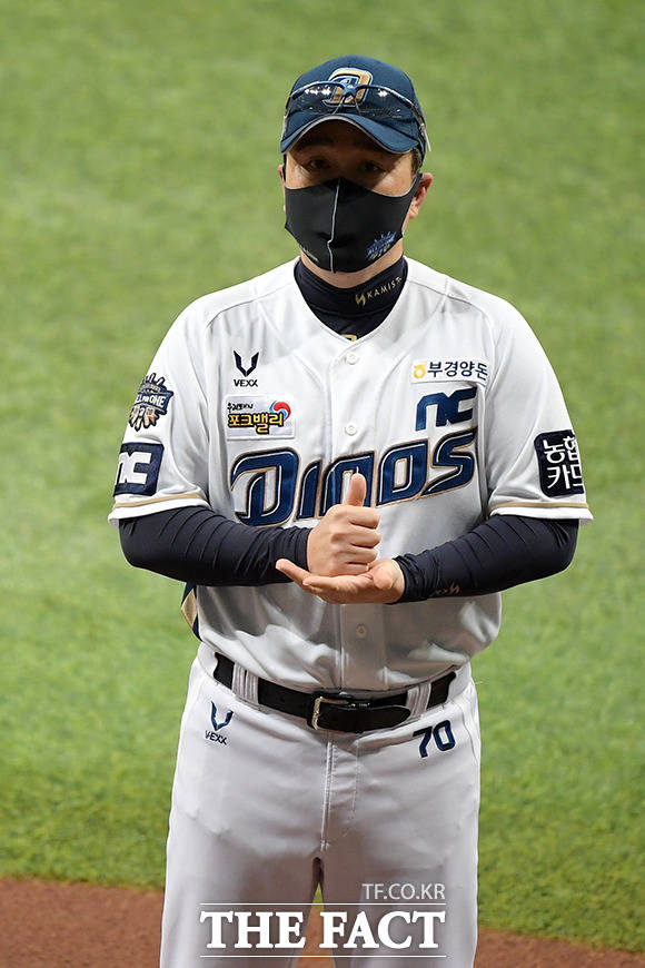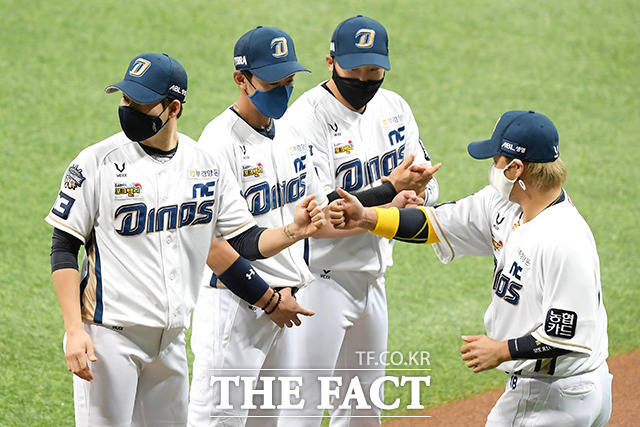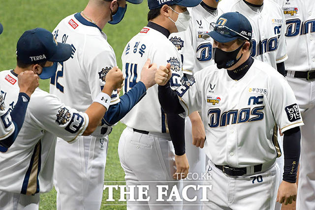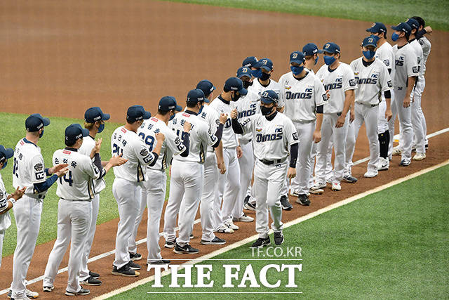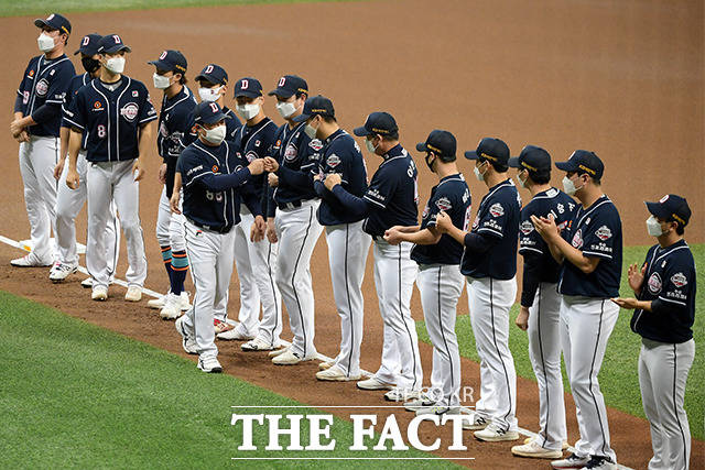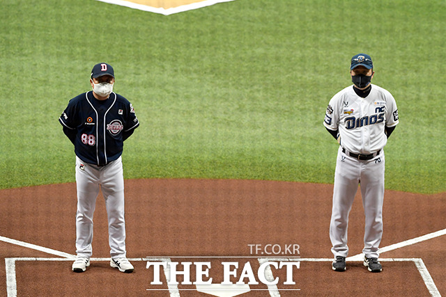 [더팩트|이선화 기자] '2020 KBO 포스트시즌' 한국시리즈 1차전 두산 베어스와 NC 다이노스의 경기가 17일 오후 서울 구로구 고척스카이돔에서 열린 가운데 두산 베어스와 NC 다이노스 선수들이 경기 전 국민의례를 하고 있다.