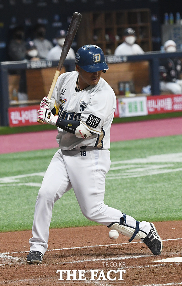 [더팩트ㅣ배정한 기자] '2020 신한은행 SOL KBO리그' 한국시리즈 1차전 두산 베어스와 NC 다이노스의 경기가 17일 오후 서울 구로구 고척스카이돔에서 열렸다. 4회말 NC 박석민이 공에 맞고 있다.