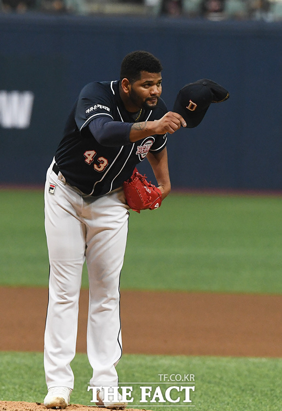 [더팩트ㅣ배정한 기자] '2020 신한은행 SOL KBO리그' 한국시리즈 1차전 두산 베어스와 NC 다이노스의 경기가 17일 오후 서울 구로구 고척스카이돔에서 열렸다. 4회말 두산 선발투수 알칸타라가 공에 맞아 1루를 밟은 NC 박석민에게 사과를 하고 있다.