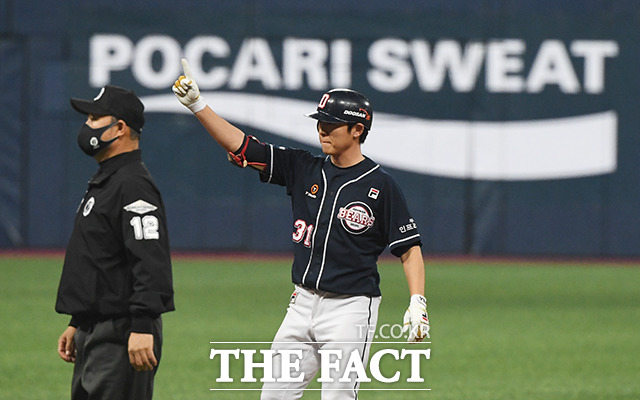 [더팩트ㅣ배정한 기자] '2020 신한은행 SOL KBO리그' 한국시리즈 1차전 두산 베어스와 NC 다이노스의 경기가 17일 오후 서울 구로구 고척스카이돔에서 열렸다. 5회초 두산 정수빈이 득점 찬스를 만드는 2루타를 친 뒤 기뻐하고 있다. hany@tf.co.kr 사진영상기획부 photo@tf.co.kr