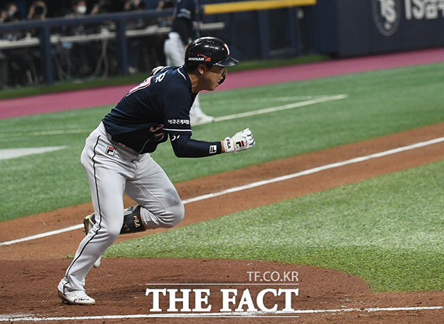 [더팩트ㅣ배정한 기자] '2020 신한은행 SOL KBO리그' 한국시리즈 1차전 두산 베어스와 NC 다이노스의 경기가 17일 오후 서울 구로구 고척스카이돔에서 열렸다. 5회초 두산 박건우가 안타를 치고 있다.