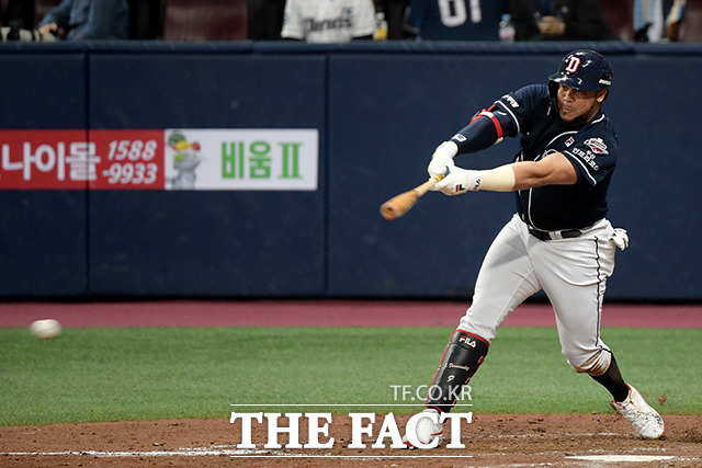 [더팩트|이선화 기자] '2020 KBO 포스트시즌' 한국시리즈 1차전 두산 베어스와 NC 다이노스의 경기가 17일 오후 서울 구로구 고척스카이돔에서 열린 가운데 5회초 두산 페르난데스가 병살타를 치고 있다.