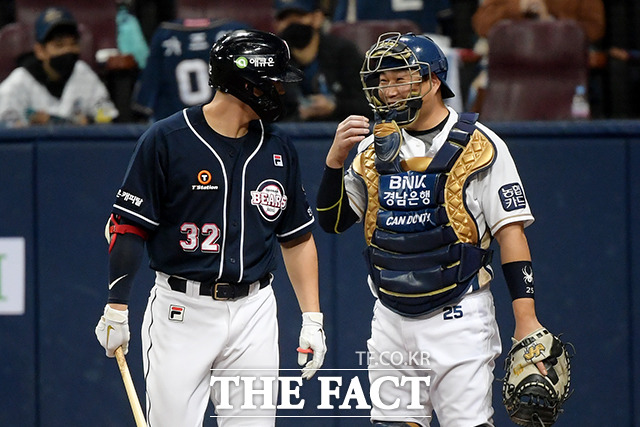 [더팩트|이선화 기자] '2020 KBO 포스트시즌' 한국시리즈 1차전 두산 베어스와 NC 다이노스의 경기가 17일 오후 서울 구로구 고척스카이돔에서 열린 가운데 6회초 NC 양의지(오른쪽)가 두산 김재환과 웃으며 대화하고 있다.