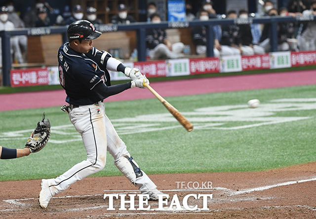 [더팩트ㅣ배정한 기자] '2020 신한은행 SOL KBO리그' 한국시리즈 1차전 두산 베어스와 NC 다이노스의 경기가 17일 오후 서울 구로구 고척스카이돔에서 열렸다. 6회초 두산 허경민이 안타를 치고 있다.